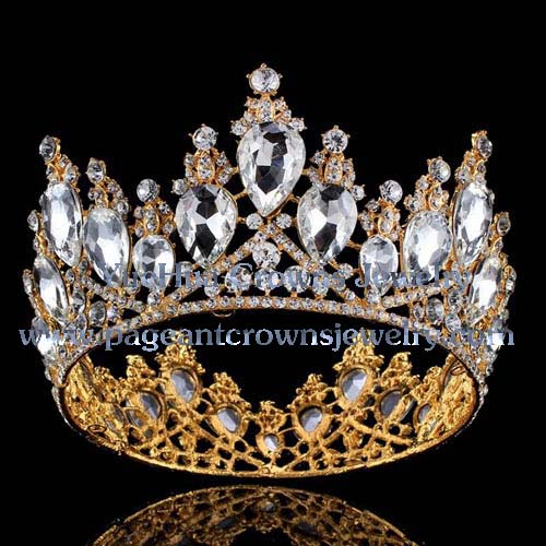 This is a full round pageant crowns with big tear drop diamonds. Large around queen crowns in silver and gold plated with colorful diamonds.